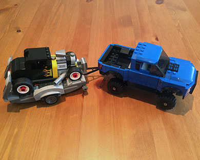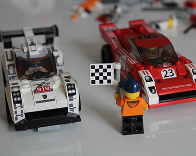 It includes four minifigures, a workshop with a winning podium at the back, a starting light, a LEGO trophy, a checkered flag, an engine lift and extra engine for the hot rod, two awesome vehicles and a ton of stickers!